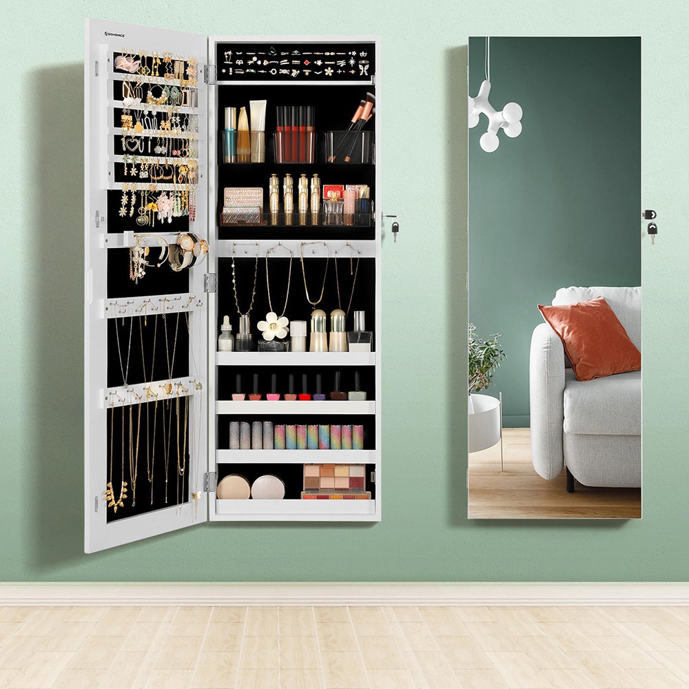 Vägghängt smyckesskåp med spegel och låsfunktion - Vit