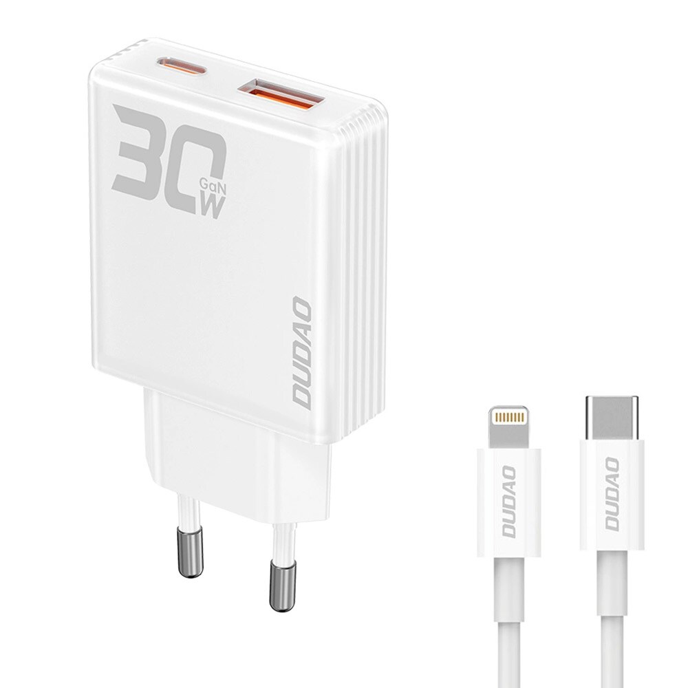 Dudao GaN USB-Laddare 30W med 1xUSB, 1xUSB-C och USB-C till Lightningkabel - Vit